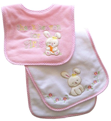 -. Feature : Single appliqued "thank heaven for girls" bib and burp set / Cotton pique/ knit terry bib and burpcloth set / Pink bib and white burpcloth with bunny applique