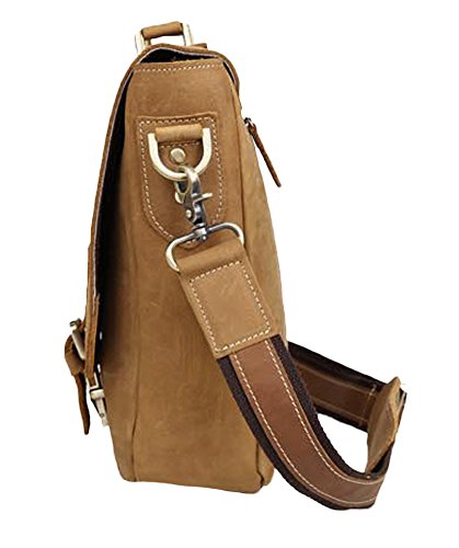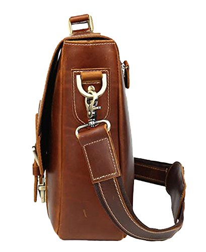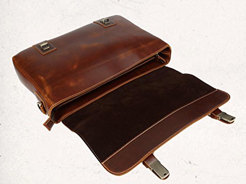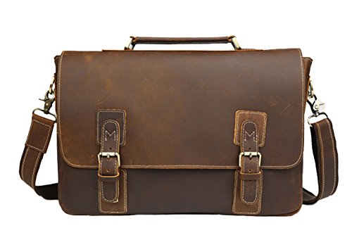-. Feature : Crazy horse leather,polyester-cotton lining / Adjustable full leather shoulder strap with detachable brass hardware buckles / 1 main pocket,1 computer compartment pocket for your 14" laptop,1 ipad pocket,phone and wallet slots inside,inside zip pocket,1 rear pocket / Front flat with twin buckles decoration and push button closure / Vintage crazy horse leather laptop bag