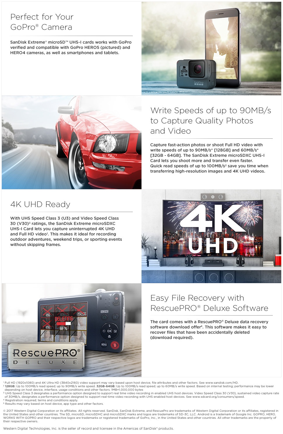 Rated UHS Speed Class 3 (U3) and Video Speed Class 30 (V30)3, this fast, high-performing card teams up with your action camera to let you capture and share unforgettable extreme sports video.