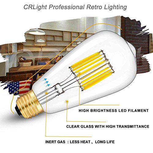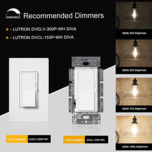 Product Type: ST64 E26 10W Soft White Dimmable LED Filament Bulb - 2 Pack Base Type: E26 Medium Base Shape Type: Antique Edison Style Working Voltage: AC 110V-130V Light Atmosphere: Soft White Glow Incandescent Equivalent: 100W Beam Angle: 360 Degrees Size: Diameter 2.5 Inch x Height 5.5 Inch Material: Metal and High-Strength Glass Light Source: 10 COB-LED Life Span: Average 30000 Hours Lifespan,16 Years Life (5 Hours per Day) Mercury-free,No UV,No Flickering,CE and RoHS Authenticate Application: Family Lighting, Offices, Executive Offices, Class/Show/Reading Rooms, Shops, Supermarkets, Public Reception Areas, etc. Please Note: 1.Most traditional incandescent or CFL bulbs dimmer can not be used for LED bulbs dimming,and some poor quality dimmer may cause flicker or not-working,to dimming these LED bulbs,please upgrade your dimmer switches/lamps to support LED bulbs. 2.In LED industry,there is no unified technical specification, different bulbs and LED dimmers usually are designed by different technology,so some kinds of LED dimmer are not compatible with CRLight's DIMMABLE LED bulbs,especially smart dimmers and switches. 3.CRLight recommended dimmer brand is Lutron: ★ - Lutron DVCL-153P-WH Diva ★ - Lutron DVELV-300P-WH Diva 0