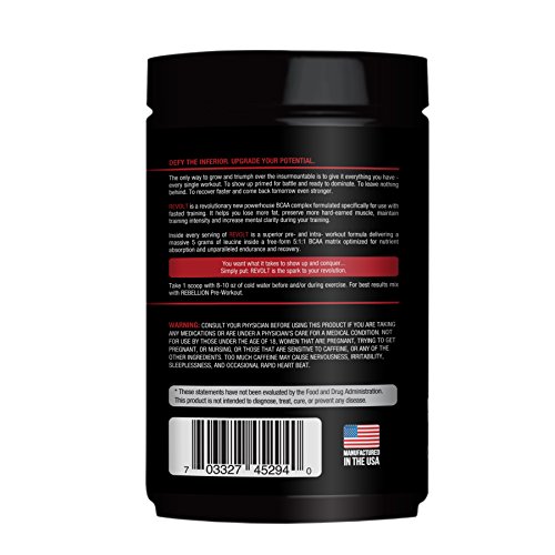 -. Binding : Health and Beauty -. Brand : BRO LABS -. EAN : 0703327452940 -. Feature : PROMOTE LEAN MUSCLE MASS. REVOLT is designed to effectively increase muscle protein synthesis (rebuilding of muscle tissue) both during and after exercise. / PRESERVE HARD EARNED MUSCLE. When training fasted your body needs REVOLT BCAAS in order to help prevent muscle catabolism. / LOSE MORE FAT. Increase fat oxidation and improve glycogen synthesis. / IMPROVE ENDURANCE AND RECOVERY. Studies where subjects consumed BCAAS have demonstrated massive increases in their endurance and ability to recover. / REDUCE PHYSICAL AND MENTAL FATIGUE. Reaction time decreases significantly both before and during exercise - a major benefit to players who must think and act fast. -. IsAdultProduct : 0 -. Label : BRO LABS -. Manufacturer : BRO LABS -. PackageQuantity : 1 -. ProductGroup : Health and Beauty -. ProductTypeName : HEALTH_PERSONAL_CARE -. Publisher : BRO LABS -. Studio : BRO LABS -. Title : Workout Recovery BCAA Fuel - Revolt - Preserve Muscle Mass, Reduce Fatigue, Improve Weight Loss (5g Leucine + Glutamine + Caffeine) By Bro Labs & Brandon Carter - 12.9 Oz (367.2g), Hypnotic Watermelon -. UPC : 703327452940
