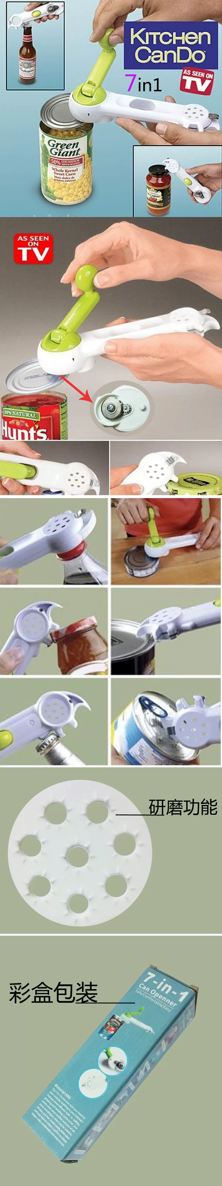 功能1:开罐头 功能2: 开啤酒瓶功能3:旋饮料螺纹圈 功能4:开罐头功能5:厅装饮料扣 功能6:开罐头 功能7:研磨