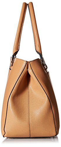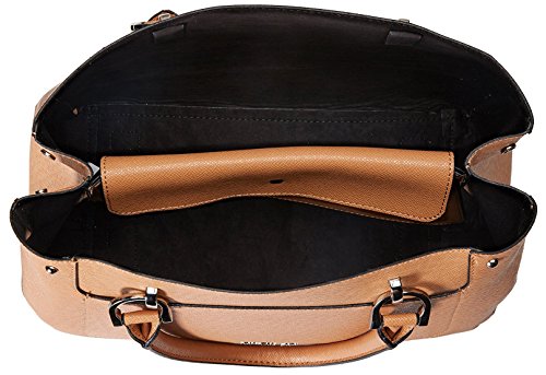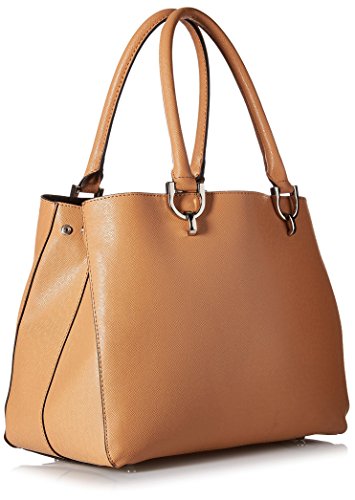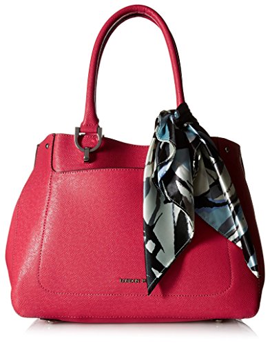 No closure. Dual rolled carry handles with decorative scarf. Exterior features brand detail at front and polished hardware. Flat base with protective metal feet. Two compartment, unlined interior flaunts center slip pocket.