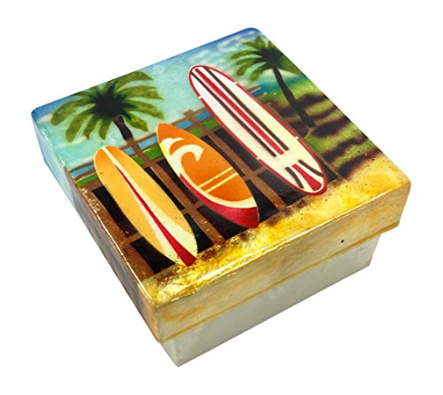 - Surfboards and palm trees are painted on the Capiz Shell Trinket Box with a beautiful iridescent effect.