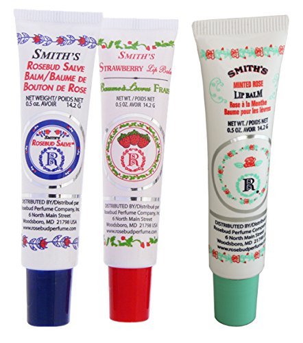 -. Feature : This package includes one Smith's Rosebud Salve Tube (0.5 oz), one Smith's Strawberry Lip Balm Tube (0.5 oz), and one Smith's Minted Rose Lip Balm Tube (0.5 oz). / Rosebud Perfume Company, Inc. is proud to present the world famous Smith's Rosebud Salve in a tube. Carry this mini moisturizing miracle wherever you go! / If you like Smith's Strawberry Lip Balm in a tin, the tube is a must have. It is a convenient way to carry the fresh strawberry flavored balm while skiing, sunbathing, or participating in your favorite outdoor experiences. / Smith's world famous Minted Rose Lip Balm is now available in a tube. You will enjoy the same zing of peppermint and rosy glow, but with all the convenience of a tube!