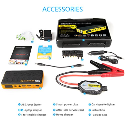 【What You Get】 CAR ROVER Jump Starter A8S, Intelligent jump cables, 12V Wall Charger, 12V Car Charger, User Manual, Our fan-favorite 12-Month Warranty and friendly customer service.