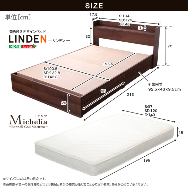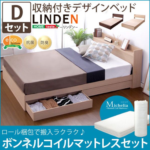 収納付きデザインベッド【リンデン-LINDEN-(ダブル)】(ロール梱包のボンネルコイルマットレス付き)