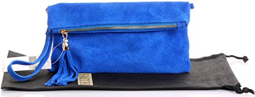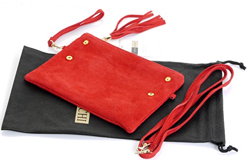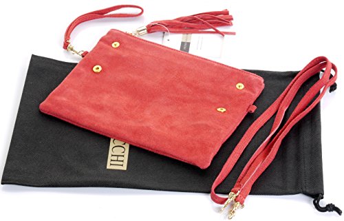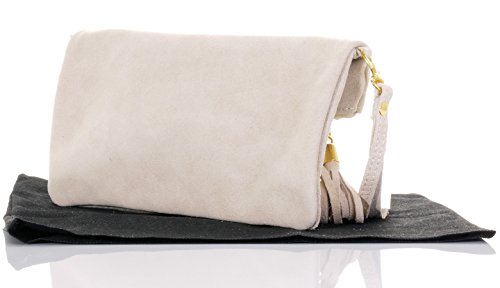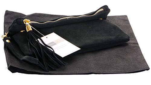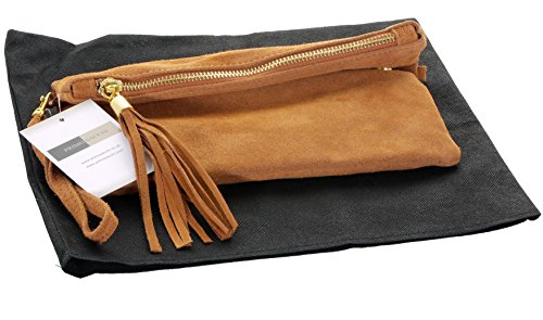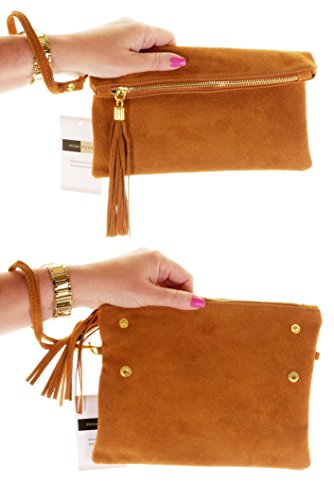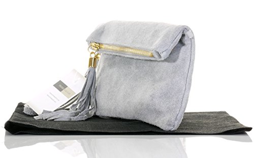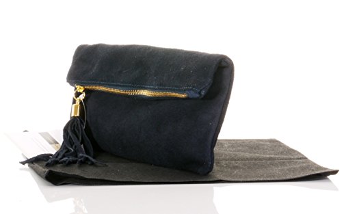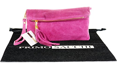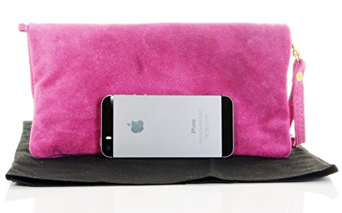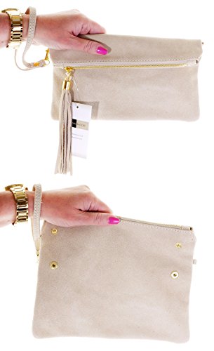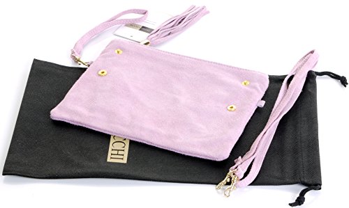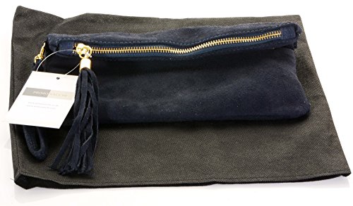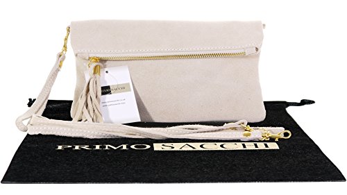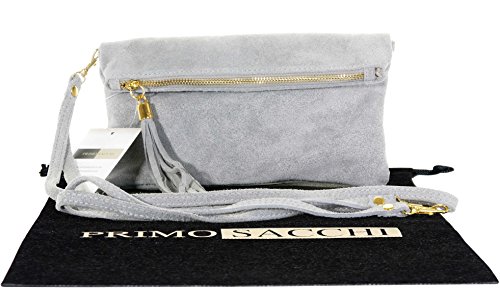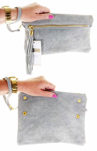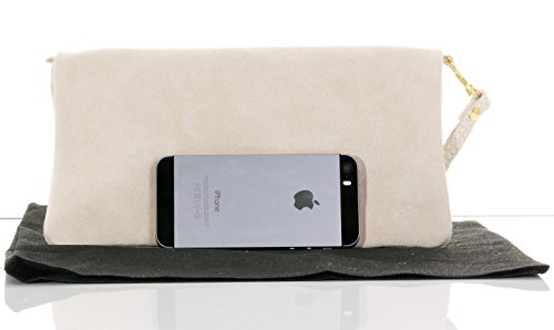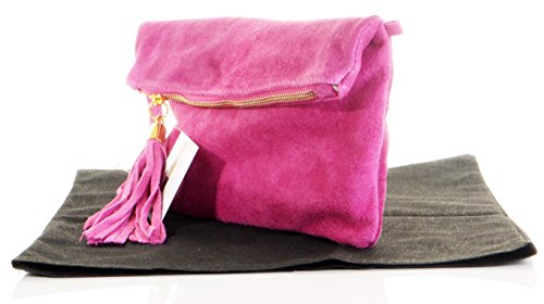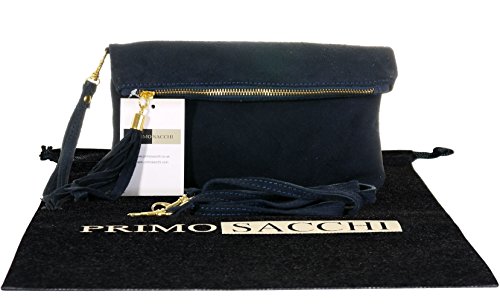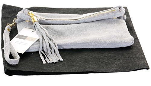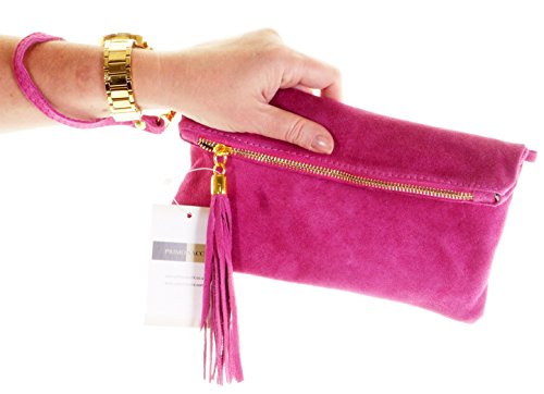 Product Description This lovely soft unstructured suede clutch, wrist, or shoulder bag is hand made in Florence from high quality Italian suede leather. The main compartment is accessed via the by the full length zip, which has a suede tassle puller. Inside, there is just the main compartment and a zipped lining pocket. The wrist strap and shoulder strap are detachable,and attach via the small suede loops on the sides of the bag, this may be a bit fiddly on first use. The strap has a length of approximately 124cm, strap to bag drop of appromimately 54cm Unfolded and 58cm Folded.