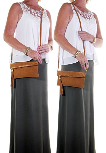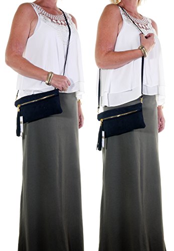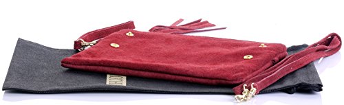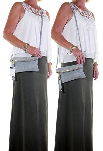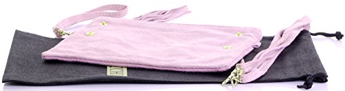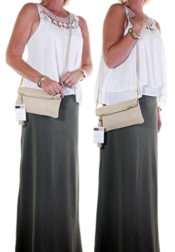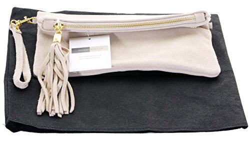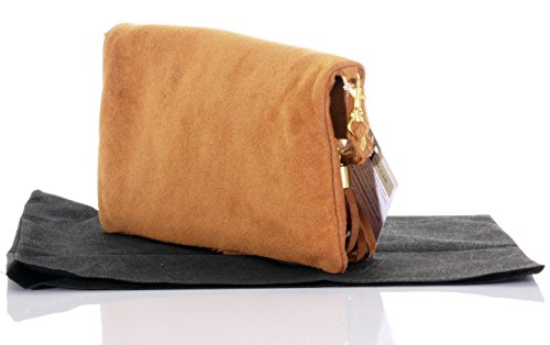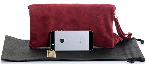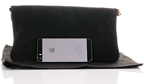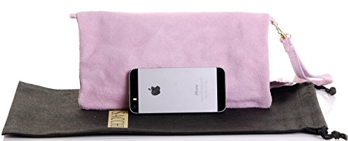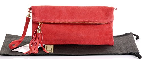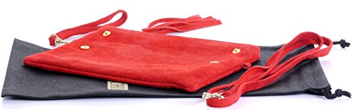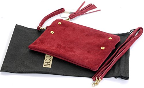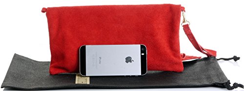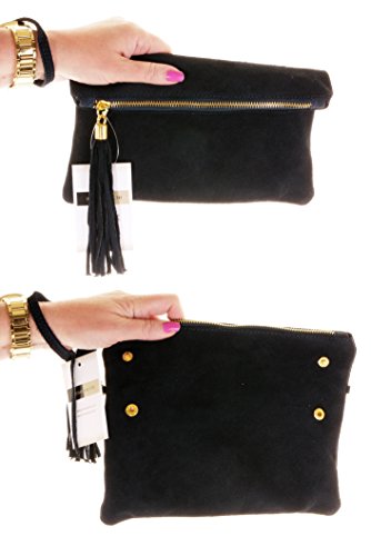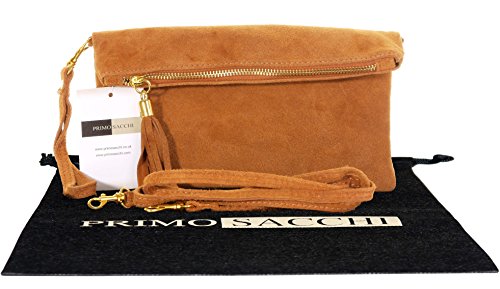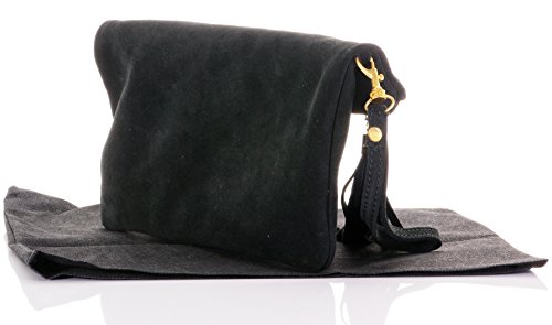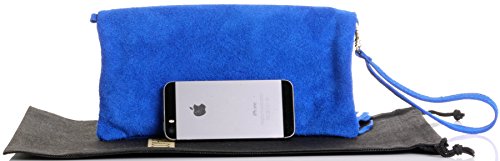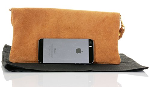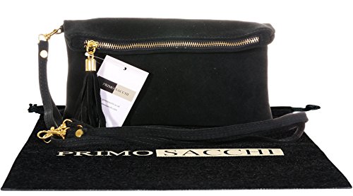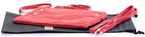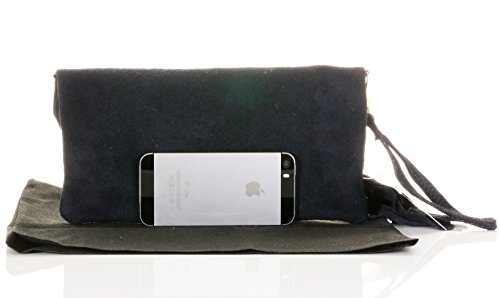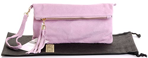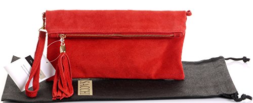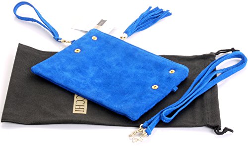 Product Description This lovely soft unstructured suede clutch, wrist, or shoulder bag is hand made in Florence from high quality Italian suede leather. The main compartment is accessed via the by the full length zip, which has a suede tassle puller. Inside, there is just the main compartment and a zipped lining pocket. The wrist strap and shoulder strap are detachable,and attach via the small suede loops on the sides of the bag, this may be a bit fiddly on first use. The strap has a length of approximately 124cm, strap to bag drop of appromimately 54cm Unfolded and 58cm Folded.