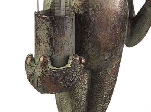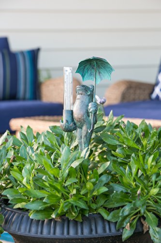 Enhance your outdoor space with this stunning polystone and metal frog statue - The frog stands at attention underneath a miniature umbrella - In his right hand, he firmly holds a rain gauge