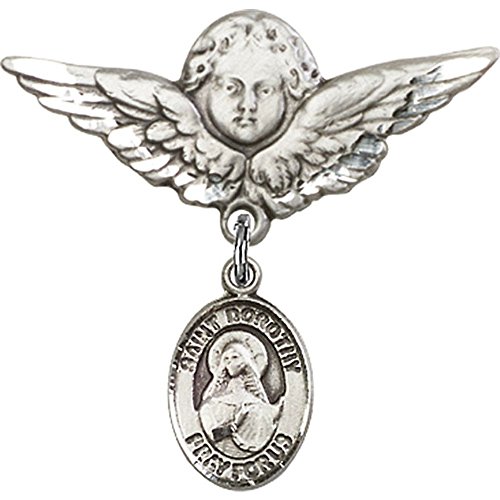 -. Title : Sterling Silver Baby Badge with St. Dorothy Charm and Angel w/Wings Badge Pin 1 1/8 X 1 1/8 inches