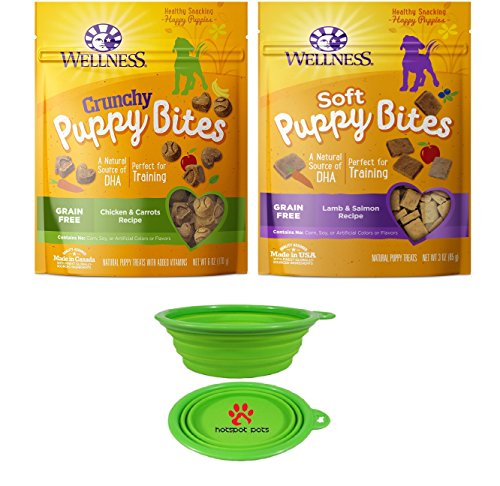 -. Binding : Misc. -. Brand : Wellness Natural Pet -. EAN : 0719707986998 -. Feature : JUST FOR PUPPY: Soft, chewy, perfectly-sized treats specially for puppies made with premium lamb and salmon. / Made with Superfoods like blueberries, delicious veggies, and omega-rich flaxseed / A natural source of DHA to promote healthy brain development Packed with antioxidants to promote overall wellbeing / 2 Pack Variety Bundle - 9 OZ Total - Chicken Carrots & Lamb Salmon Flavored Treat Snack Bites for Dogs / Each Order Comes With a Hot Spot Pets Collapsible Bowl for your Travel Convenience -. Label : Wellness Natural Pet -. Manufacturer : Wellness Natural Pet -. PackageQuantity : 2 -. ProductGroup : Pet Products -. ProductTypeName : PET_SUPPLIES -. Publisher : Wellness Natural Pet -. Studio : Wellness Natural Pet -. Title : Wellness Puppy Bites for Dogs Variety Bundle 2 Pack (Lamb Salmon & Chicken Carrots) W/ Bonus Hot Spot Pet Travel Bowl -. UPC : 719707986998