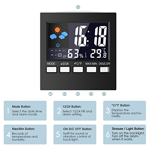 MULTIFUNCTIONAL THERMOMETER MONITOR: Work as hygrometer, thermometer, alarm clock, calendar, week, day, time, weather forecast, comfort icon ect.