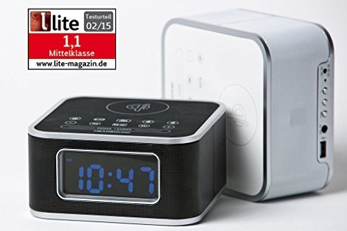 Bluetooth-Lautsprecher; Wecker mit zweifachem Alarm; qi-Ladestation (Induktion); dimmbares Display; Freisprechanlage