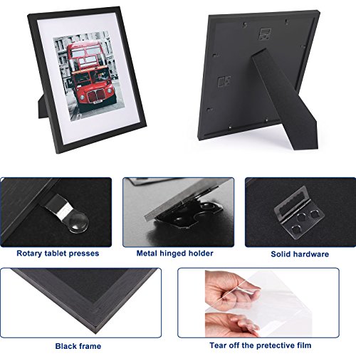 -. Feature : PREMIUM MATERIAL: Environmental MDF is durable to last for a long time, black texture molding adds elegance to your home, and highly transparent PS (polystyrene) board is more solid than glass (please remember to remove the protective film before use), perfect for kids' rooms / FIT MULTI SIZES PICTURES: Perfect for photos sized 11'' x 14'' without mat and 8'' x 10'' with mat, also great for other sizes with tailored mat / EASY OPENING TABS: With backing rotary tablet presses, it's easy to insert photos and sturdy to withstand repeated pictures changing / MULTI-ANGLE DISPLAY: Mount on the wall vertically or horizontally with the hanging hardware or stand on the table with the back easel / MINIMALIST DECORATION - With it's simple and modern design, it is a good decoration piece for the hall, dining room, bedroom, study etc.