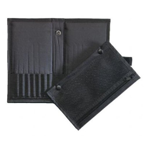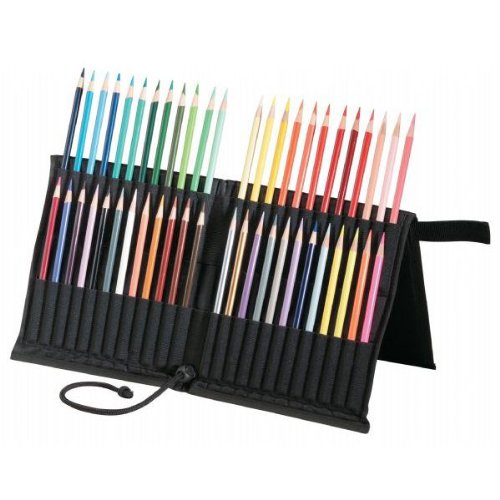 Durable black nylon pencil and brush holder with elastic webbing holds up to 48 pencils or brushes. Folds into a 17" x 7" protective case with hook & loop fastener. Fits most pencils and brushes up to 12" long. Adjustable drawstring cord adjusts to preferred angle.