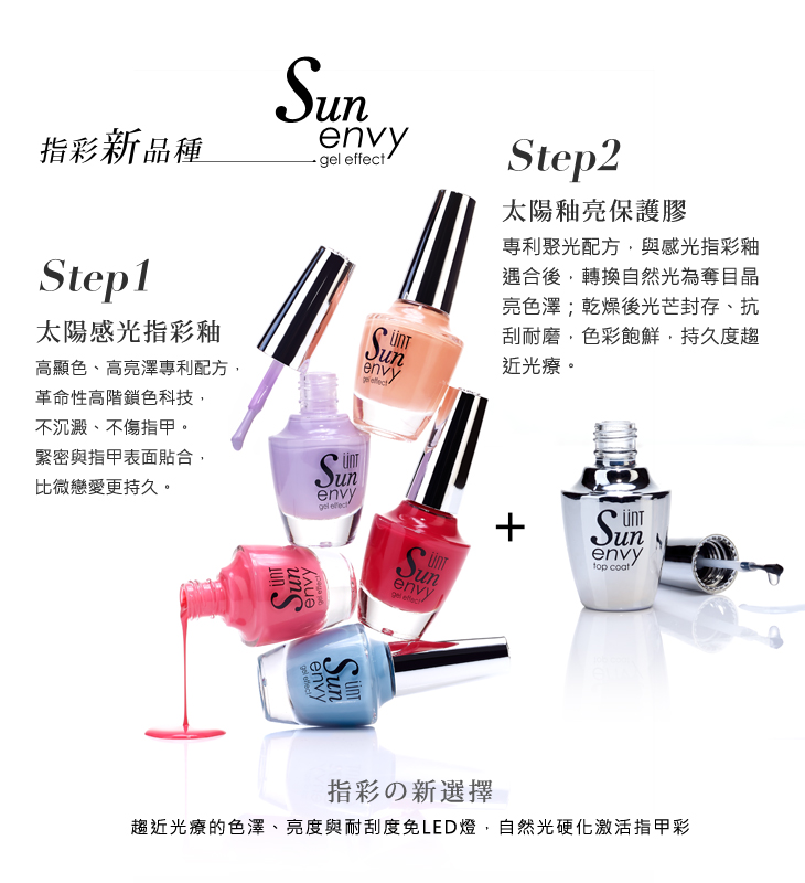 Step 2:太陽釉亮保護膠 與太陽感光指彩釉搭配使用,能神奇轉換為寶石般晶亮色澤。 乾燥後光芒封存、抗刮耐磨、色彩飽鮮,一般去光水可卸。
