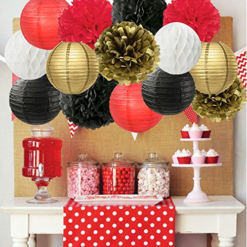 - Pretty and popular black white red gold Ladybug Birthday Party Decoration tissue paper pom pom paper lantern and paper honeycomb ball package,include 6pcs mixed sizes tissue paper pom poms:2 pcs black(1*8inch+1*10inch), 2 pcs gold(1*8inch+1*10inch), 2 pcs red(1*8inch+1*10inch);2 pcs 8inch balck paper lantern, 2 pcs 8inch gold paper lantern, 2 pcs 8inch red paper lantern;2 pcs 8inch paper honeycomb balls.