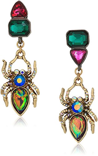 gold and hematite tone drop earrings with mismatched post stones and multi-stone, colorful spiders