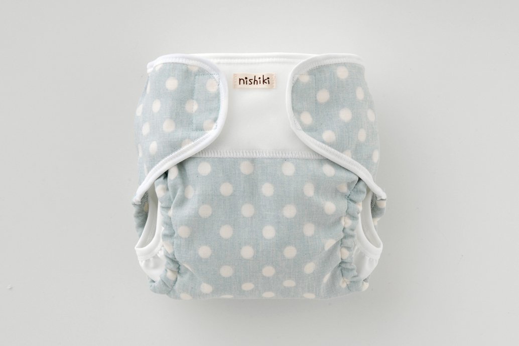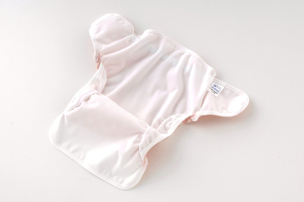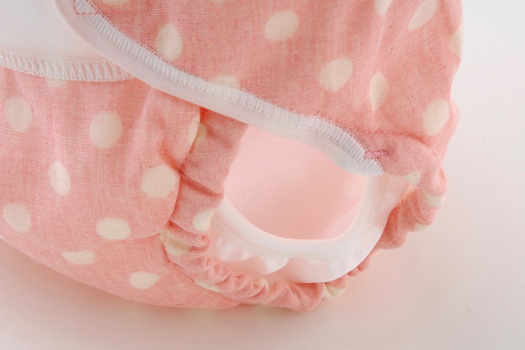 Outer belt diaper cover with rubber around thighs.