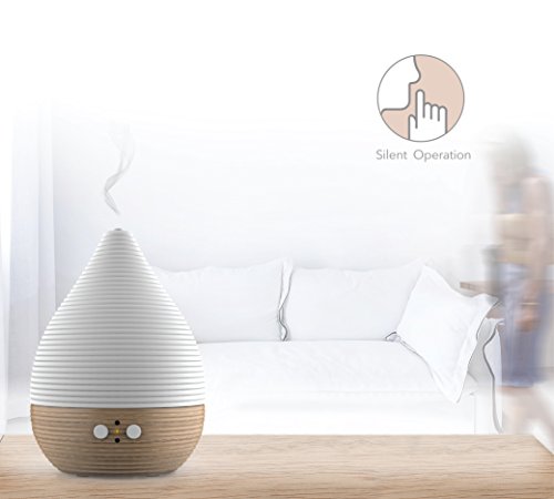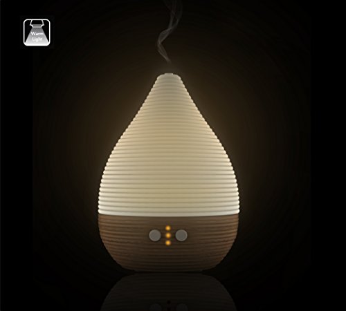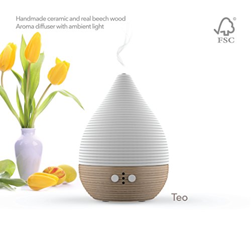 - Feature : NEW design from Belgium, the TEO aroma diffuser and humidifier gives you a stylish piece of furniture in your home in order to relieve the stress and improve your mood. (30-days money back and 1 year warranty) / Real BEECH WOOD base (FSC certified) and HANDMADE CERAMIC cover for smooth and friendly daily and sleep use. This advanced aromatic diffuser is also good against pet and smoking odors, allergies, and cold flu germs / AUTOSTOP when no more water, 1H 2H 3H TIMER and lasting up to 12 HOURS in intermittent mode / 6 hours in fully on mode for you and your children thanks to its 110ML water tank. It can cover up to 250 square ft surface / Breathing/meditation (light can fade gradually up and down), fixed or turned off warm yellow LED giving you a relax and peaceful lighting experience. This product is perfect for spa and massage room. It also adds moisture and improves your air quality / EXTRA LONG 72 Inch transformer cord that ables you to install it almost everywhere in your home