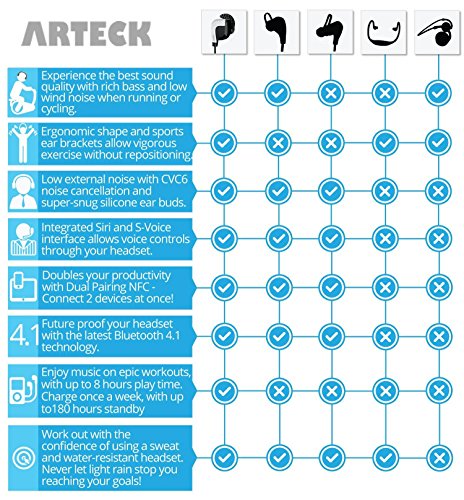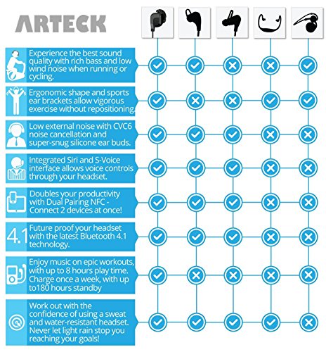 -. Feature : The latest CSR 4.0 + EDR (fully backward compatible) for longer playing time, standby time, longer distance, better stereo sound and noise cancelling. / The unique design silicon tips remain the earbuds in the ears comfortable even when you are having sports, running, gym, exercise, yoga, bodybuilding, with sweat resistance. / Build-in HD microphone and user-friendly button control makes you easily to answer the phone calls, volume control and pre/next track control. / The Arteck Bluetooth Earbuds support all Bluetooth devices like iPhone6, 6 plus, 5 5s 5c 4 4s, iPad iPod, Android phones, tables and others. The multi-point support to connect 2 mobile phone at the same time. / What you get: Arteck Sports Earbuds, 6 customized silicon tips and ear hooks, 1 usb charging cable, user manual and 24 months friendly customer service.