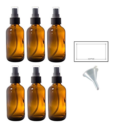 4 oz Amber Glass Boston Round Treatment Pump Bottle (6 pack) + Funnel and Labels for essential oils, aromatherapy,food grade, bpa free