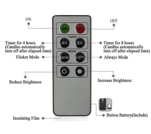 REMOTE CONTROL: Comes with a 8 function remote control, On / Off / 4 hour / 8 hour / Candle / Light / Dim / Bright. Timer for 4 or 8 hours, candles automatically turn off after elapsed time. When set the candles to candle mode, flickering bulb imitates a real flame, making the candles flicking like real candles. When set the candles to light mode, the flame doesn¡¯t flick, just keep still. You can change the brightness of the candles by setting the candles to dim or bright mode.