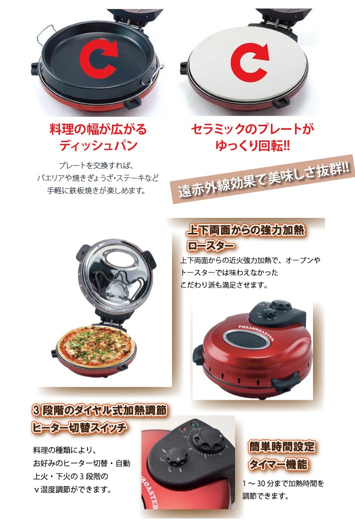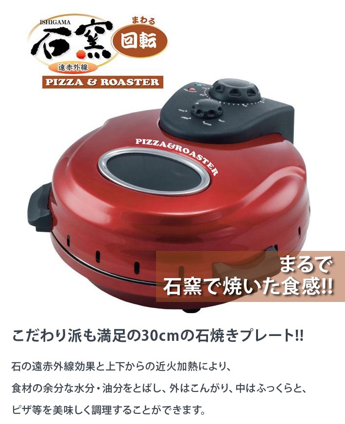 | 特殊な石のプレートをピザが回転しながら焼く為、食材の余分な水分、油分を飛ばし、表面はこんがり中はふっくら美味しい本格ピザが楽しめます。 焼き具合がわかる窓、便利なタイマーも付いています。 石の発する遠赤外線で石ヤキイモ等ホクホクの美味しさで楽しめます。 30cmのピザが丸々焼けます。 オーブンやトースターでは味わえなかったこだわり派を満足させること間違いなしです。 プレートを交換すれば、パエリアやステーキ等も絶品の焼き上がりで楽しめます。 JANコード 4995397125008 |