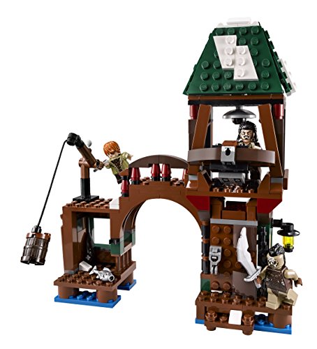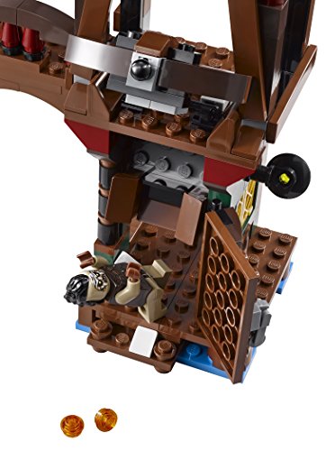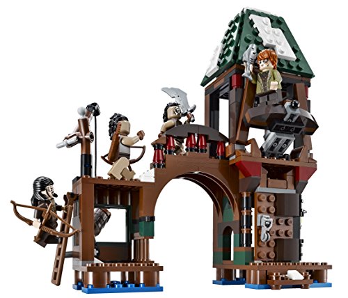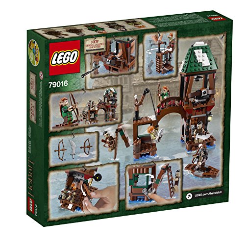 Defend against an Orc Attack on Lake-town with Bard the Bowman, a firing crossbow, booby-trapped door and ladder explode function. Lake-town is under attack from evil Orcs! Rush Bain son of Bard to the bell tower to hand over the Black Arrow to his heroic father. Target the invaders with the crossbow. If an Orc attempts to enter, the booby-trapped door will make fireballs fall on his head! Hurry across the bridge to defend the dock. Hoist goods up with the crane and activate the ladder explode function to send an Orc flying off the side wall. Board the boat with Tauriel and use her Elven warrior skills to outwit the enemy. Includes 5 minifigures with assorted weapons: Bain son of Bard, Bard the Bowman, Tauriel and 2 Hunter Orcs. Includes 5 minifigures with assorted weapons: Bain son of Bard, Bard the Bowman, Tauriel and 2 Hunter Orcs. Features a bell tower, bridge, wall with ladder and explode function, booby-trapped door with 2 fireball elements, firing crossbow with the Black Arrow, and a dock with crane. Also includes a boat, a fish and a barrel.Feature
