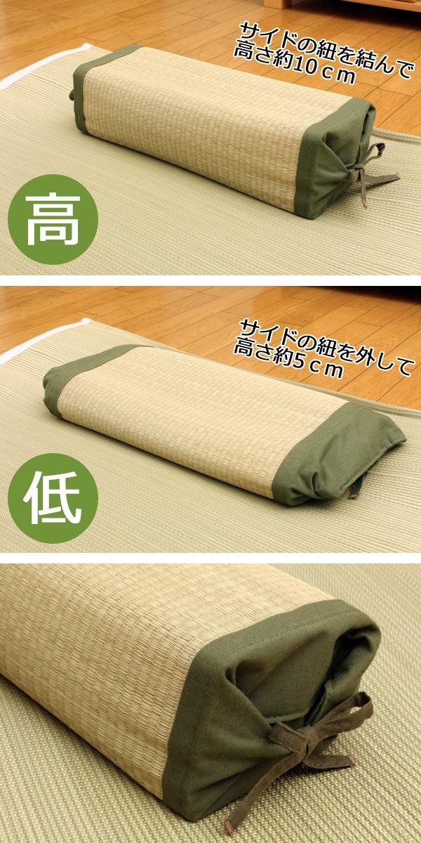 | 紐の結びを変えて頂く事で約5~10cmの間で高さが調節出来ます。国産のしなやかない草を使用していますので、柔らかくすべすべとした肌触りです。い草には抗菌・防臭効果のある青森ヒバ加工を施しています。中材には国産のい草チップをたっぷり使用しています。 |