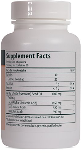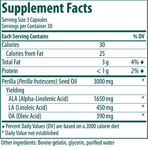 Perilla EFA 90 gels This item is not available for shipment outside the US Essential Fatty Acid Supplement Supplement Facts Serving Size: 3 capsules Servings per Container: 30 Each Three Capsules Contain Calories 30 Calories from Fat 25 Total Fat 3 gms Protein 1 gm Perilla (Perilla frutescens) Seed Oil 3000 mg Yielding ALA (Alpha-Linolenic Acid) 1650 mg LA (Linoleic Acid) 450 mgs OA (Oleic Acid) 390 mgs Other ingredients: Gelatin, glycerin, purified water Recommended Adult Dose: Take three capsules two times daily with meals, or as recommended by your healthcare practitioner. Quality Assurance Tamper-resistant package. Do not use if outer seal is missing or broken. Store in a cool, dry place. Guaranteed to contain no added wheat, starch, yeast, gluten, corn, soy, salt, sugar, artificial coloring or flavoring, preservatives, or dairy products.Feature