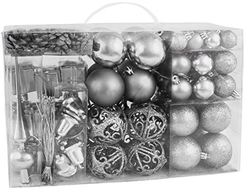 BRUBAKER 102 Pack Assorted Christmas Ball Ornaments - Shatterproof - with Green Pickle and Tree Topper - Designed in Germany - Silver