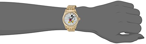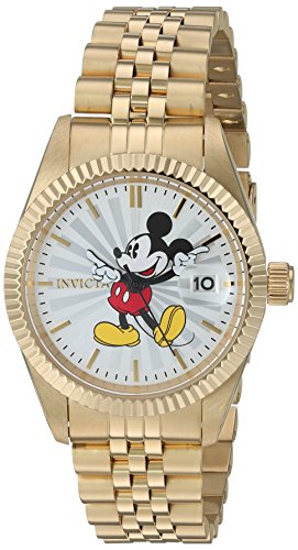 Invicta 22775 Disney Limited Edition women's watch features a 36mm wide and 13mm thick yellow gold plated solid stainless steel case with a fixed bezel and textured push-pull crown. Invicta 22775 is powered by Japanese TMI PC32A quartz movement. This beautiful watch also features Mickey mouse printed sharp looking silver tone dial with white accents black luminous hands and index hour markers along with the date display function, scratch resistant mineral crystal and water resistant to 50 meters. Invicta 22775 is equipped with an 18mm wide yellow gold plated solid stainless steel bracelet with a fold over clasp. Invicta 22775 women's Disney Edition silver dial yellow gold stainless steel watch is brand new and comes in an original Invicta gift box and is backed by a 5 year limited warranty.Feature
