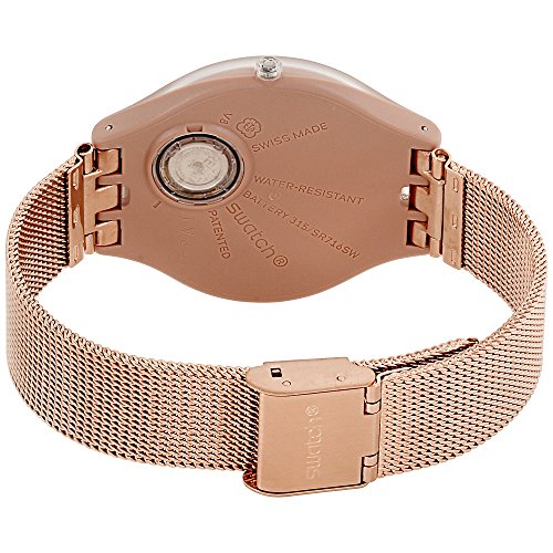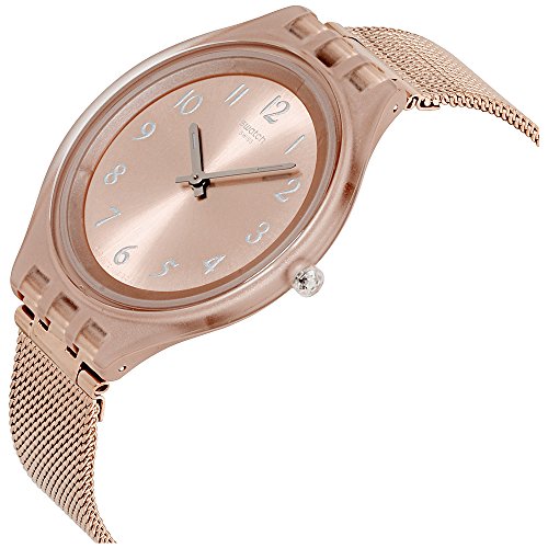 Swatch Skin Skinchic Pink Dial Stainless Steel Ladies Watch SVUP100M. 40 mm semitransparent pink plastic case with a pink dial, a plastic crystal, silver tone luminescent hands, and silver tone Arabic numeral hour markers. Printed logo beneath the 12 o'clock position. Hands: hours and minutes. Case thickness of 6 mm. Push / pull crown. 17 mm rose gold tone stainless steel bracelet with a sliding buckle clasp. Quartz movement and water resistant up to 30 meters. Skin series.Feature