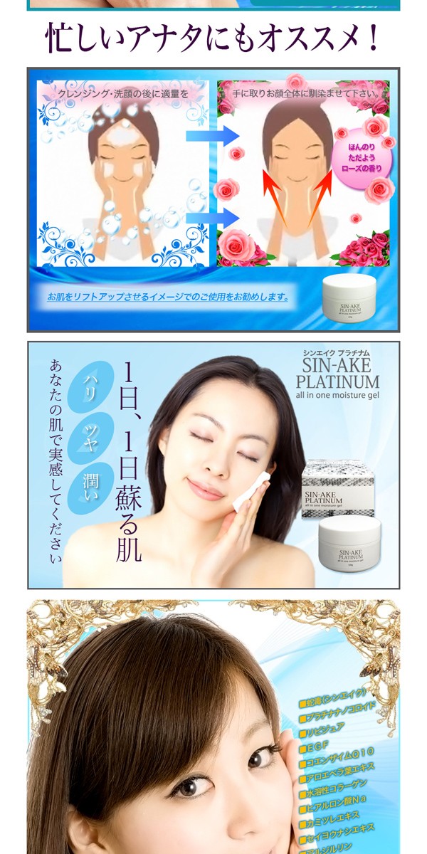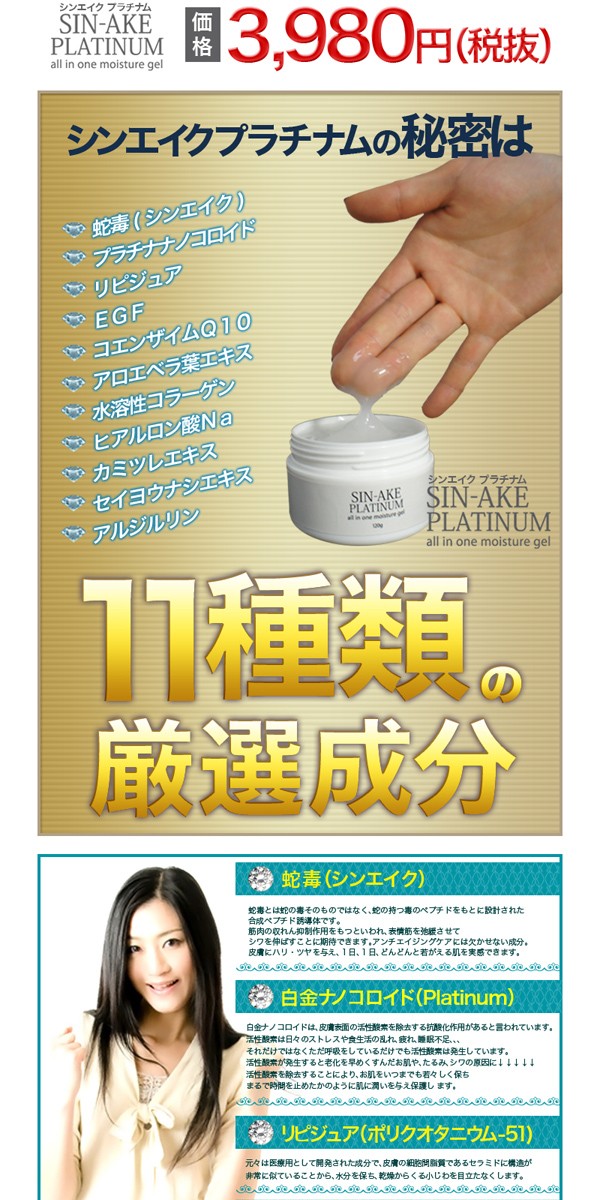 水、BG、グリセリン、ジ酢酸ジペプチドジアミノブチロイルベンジルアミド、白金、銀、炭酸水素Na、セルロースガム、ヒアルロン酸Na、水溶性コラーゲン、ポリクオタニウム-51、ヒトオリゴペプチド-1、リン酸Na、レシチン、ダイズ油、アセチルヘキサペプチドー8、ユビキノン、酢酸トコフェロール、スクワラン、アロエベラ葉エキス、カミツレ花エキス、乳酸桿菌/セイヨウナシ果汁発酵液、(アクリレーツ/アクリル酸アルキル(C10-30))クロスポリマー、水酸化K、クエン酸、クエン酸Na、エタノール、フェノキシエタノール、メチルパラベン、プロピルパラベン |