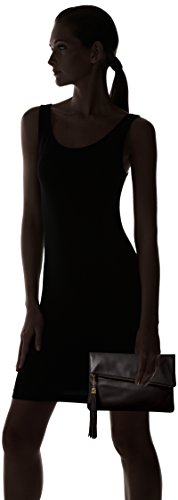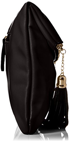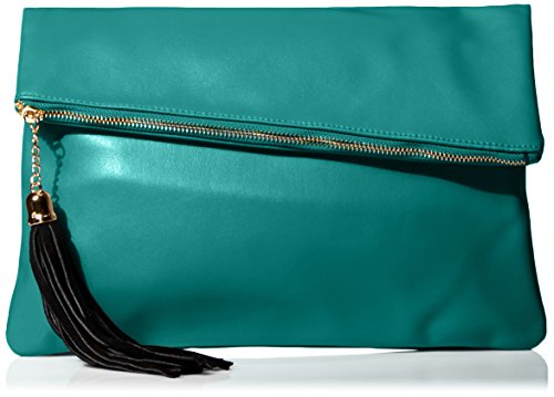 This modern asymmetric foldover style evening clutch can compliment your style effortlessly. Simple and sleek lines with a statement making tassel ornament on the zipper pull create an exclusive, one-of-a-kind evening purse that is sure to turn heads. Beneath the luxurious leatherette exterior boosts a roomy interior, 2 open slip pockets and 1 zippered pocket to keep smaller essential items organized. An exterior pocket provides extra and easy to access storage for cell phones, keys or lip-gloss. This designer inspired evening clutch is this season's must have fashion accessory. Approximate Dimensions (in inches): Folded - 15.5 L x 0.25 W x 11.25 H. Unfolded - 15.5 L x 0.25 W x 13 H.Feature