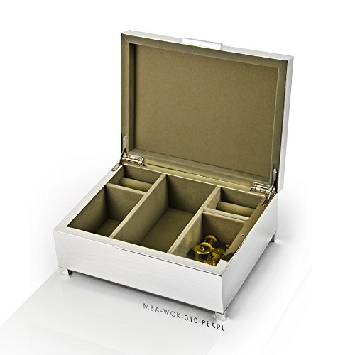 - Tune: 36 note movement (please see above for available song titles) - Mother of pearl musical jewelry box - Exterior (top): pristine mother of pearl checkered design - Exterior (base): mirrored silver finish - Interior: earth grey/olive suede fabric 2 ring rolls, 1 small, 1 large compartment - Stainless steel construction - Dimensions: 6.75" x 8.75" x 3" 0