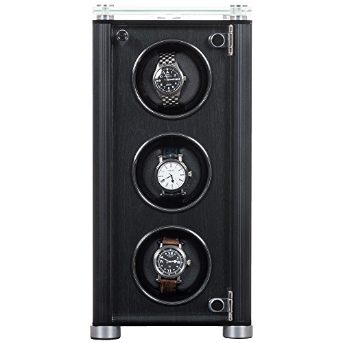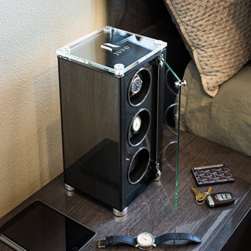 Studio : Time Atelier Publisher : Time Atelier Binding : Watch Product Description The JUVO M3 triple automatic watch winder features a contemporary modern design to hold three of your luxury watches, and keep them fully wound for accurate time. The JUVO M3 case is hand-made made with fine materials comprising of high gloss wood panel, glass cover, metal, and a fancy glass plate on top. Each winding unit has an oversized, high quality memory foam cushion with PU leather, and automated LED lights. There are four rotation options which are easy to operate with a turns per day (TPD) rate of 650 to 1500. It's also designed to rotate in three directional settings (Clockwise, Counter-Clockwise, Bi-Directional), which enables it operate majority the watch brands such as Rolex, Omega, Tag Heuer, Seiko, Brietling, Patek Philippe, Hublot, Audemars Piguet, Victorinox, IWC, Bulova, Hamilton, etc. The watch cushion can fit bigger and heavier watches (up to 55 mm). ITEM NUMBER: TA89663 COLOR: ALL BLACK DIMENSIONS: 7.87" L x 7.87" W x 16.02" H POWER ADAPTER: 110/240V AC power adapter ACCESSORIES: Microfiber cloth, white gloves, and instruction manual. 0