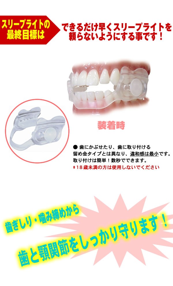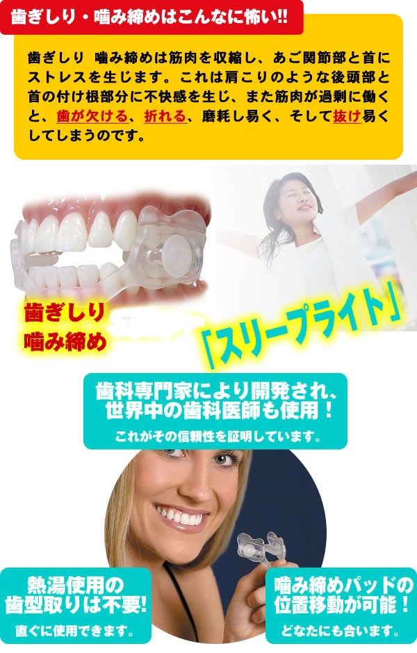 | 唇は閉じて、歯は離してを習慣づけ、歯ぎしりの悪い習慣から早く抜け出し、寝ているときの神経筋肉をリラックスさせます。噛み締めパッドの位置移動が可能だからどなたにも合います! |