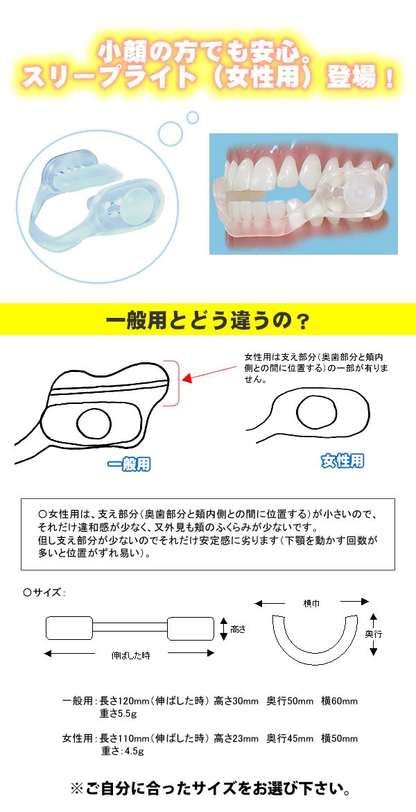 | サイズ | 【スリープライト】長さ:120mm(伸ばした時)、高さ:30mm、奥行:50mm、横60mm 【スリープライト(女性用)】長さ:110mm(伸ばした時)、高さ:23mm、奥行:45mm、横50mm |