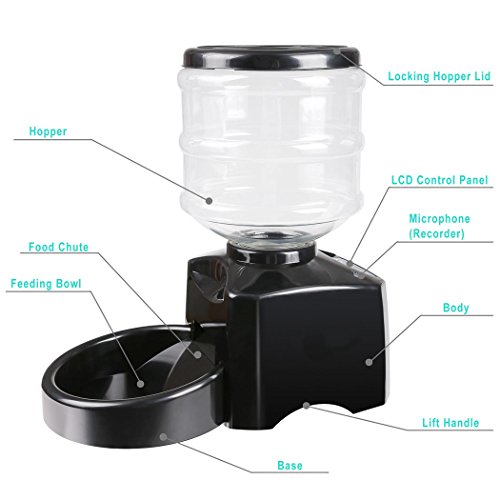 Feature: Programmable portion control (from 1 cup to 12 cups) and feeding schedule (1 to 3 times per day). See-through food drum with capacity of up to 5.5 liters of dry food. Work best with 10cm or smaller diameter dry food. Capable of recording up to 10-sec voice message to be played three times for each feeding. Battery capacity is shown on LCD. The Biggest Feature of Automatic Pet Feeder is that you can set a 10 second long voice to summon your pet to eat at a good time, this interaction will bring your pets more fun. According to the pet's appetite to set feeder times and the amount of food per day, through the transparent food box you can determine how much food your pet eat every day.