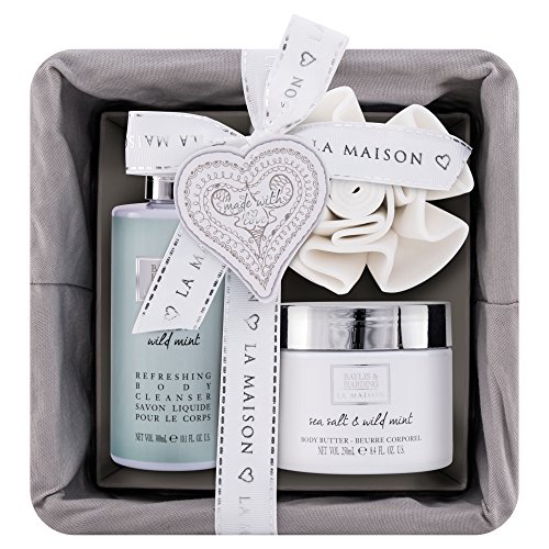 This Baylis & Harding La Maison Sea Salt & Wild Mint Luxury Gift Basket is an eye-catching selection of festive delights all displayed in a stunning gift basket tied with La Maison ribbon. The two products are expertly crafted to work in harmony on the skin with the 300ml Body Cleanser reenergizing and invigoration the skin while the 250ml Body Butter helps lock in moisture leaving skin feeling soft and smooth. The EVA Body Polisher helps the products last longer and give an exfoliating boost to bath time. The aromatherapy benefits of the refreshing Sea Salt & Wild Mint create a relaxing spa-like atmosphere in the comfort of your own home. With its simple white and duck egg blue colour palate, this gift set is sure to delight anyone who finds it under the tree on Christmas morning.Feature