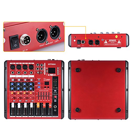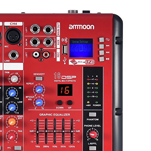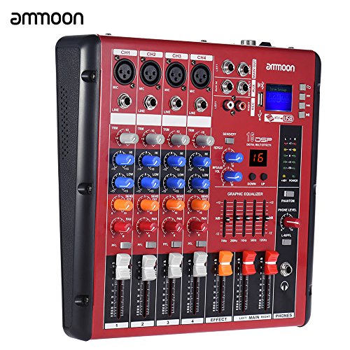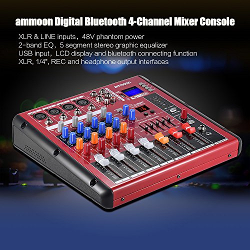 Studio : ammoon Publisher : ammoon Product Description Features: 4 channels mixing console with XLR, balanced LINE inputs and 48V phantom power. Each channel has TRIM, 2-band EQ, SEND EFFECT, PAN control knobs and volume control faders. The PEL switch allow you to monitor the channel that the PEL is turned "ON" only. With XLR (L/ R) 1/4" (L/ R) stereo output jacks and REC (L/ R) headphone interfaces. With USB input interface and LCD display as well as control buttons. Supports connecting your device to the mixing console via bluetooth. With power and output level indicator lights for easy monitoring and operation. Highly accurate 5 segment stereo graphic equalizer.