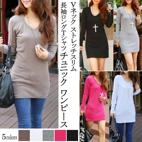| 商品名 | Vネック ストレッチスリム 長袖ロングTシャツ チュニック ワンピース | ||