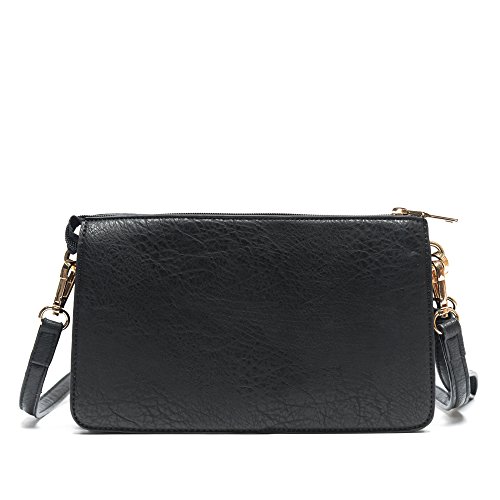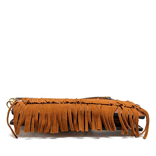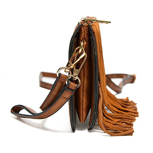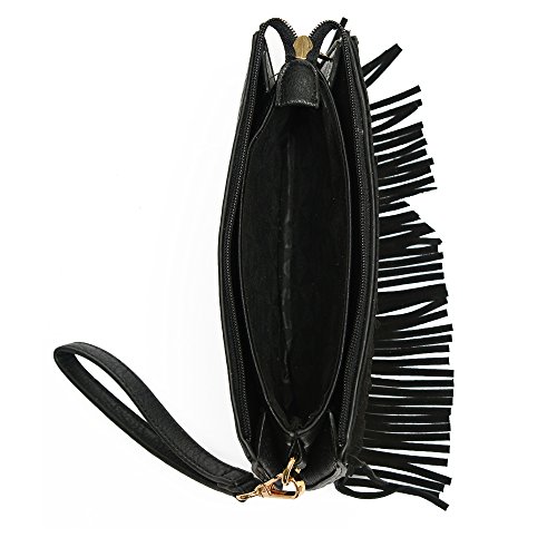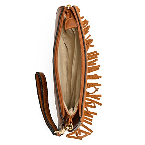 -. Feature : Soft faux suede & faux leather & gold tone hardware / Top zipper closure. Double layer faux suede fringe / Three large interior compartments & fully fabric lining in middle compartment / Adjustable & removable shoulder strap (22~25") drop & removable Wrist Band (8.5") / 9.5" (W) x 6" (H) x 1.5" (D)