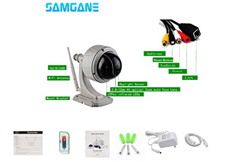 -. Feature : Stunning Full HD 1080P Video at 25fps,Seamlessly Stream Video to your Smartphone, Tablet, Apple Mac or Windows PC.You can Remote Record and Playback via Pre-Installed 16GB SD Card ,microphone and audio external interface is reserved / Smart motion detection & alert: schedulable motion detection, timing recording, motion recording and real-time motion alert via email and phone notification .Indoor/Outdoor Weatherproof Camera Housing - You can install the cameras indoors and outdoors to cover your home in all areas / Longer Night Vision: With 22Infrared LED, night vision up to 65 feet. Long distance makes you see further and bigger. It also enables a high-quality of day and night surveillance / Remarkable Field of View: Equipped with high quality 4x Optical Zoom Lens (f=2.8~12mm) Auto-focus, 355° Horizontal Pan and 90° Vertical Tilt Rotation Range Create a Complete 360° Coverage / WARRANTY?Full one-year warranty support provided directly by Samgane please feel free to contact us if you need assistance.