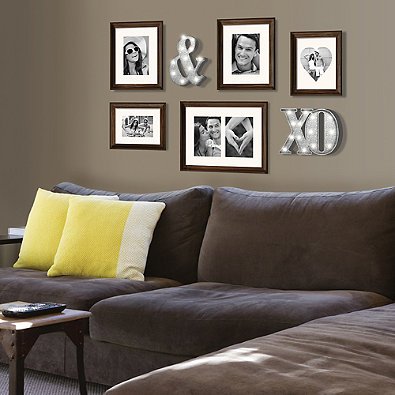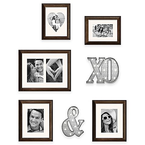 -. Feature : Create a fabulous display starring you and your loved ones with this Wall Solutions 7-Piece Marquee Frame Set / Assorted-size frames feature white mats and a rustic wood-grain finish / Eye-catching lighted symbols have a galvanized metal finish / LED lights have on/off switches and timers that automatically turn off after 3 hours / Holds 6 photos / Frames can be hung vertically or horizontally / Plastic, glass, and metal / Overall wall space required using the template is 38.5" W x 25" H / Uses 4 AA batteries (not included) / / 7-piece set includes: / Two 5" x 7" frames, each measures 7" x 9" overall / One 4" x 6" frame, measures 6" x 8" overall / One 2-opening 5" x 7" frame, measures 10" x 13" overall / One 7" x 9" "XO" symbol with LED lights / One 8.5" x 6.3" "&" symbol with LED lights / 1 full-size wall template for easy hanging / / Imported