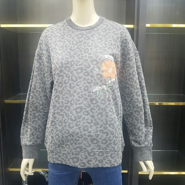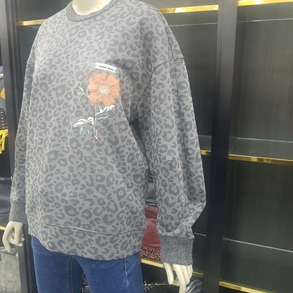 꽃 자수가 고급스럽게 패치된 루즈한 핏의 맨투맨 티셔츠입니다