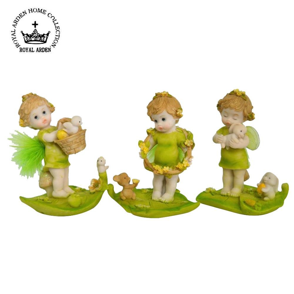 愛らしい表情としぐさがキュートなベビーフェアリーたち。お部屋に飾ると癒されます♪ 製造国:中国 素材・材質:樹脂 商品サイズ:W8×D6×H10cm ※サプライヤー直送品 ご注文後5~6営業日後の出荷となります【商品名】ロイヤルアーデン オブジェ フェアリー 3Pセット グリーン 64192